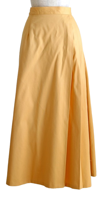 サイドにプリーツが入った品のいいロングスカートです。ツイル、オックス、デニムなど、裏地無しで着用できる生地がおすすめですが、ウールなどでも品よく仕上がると思います。