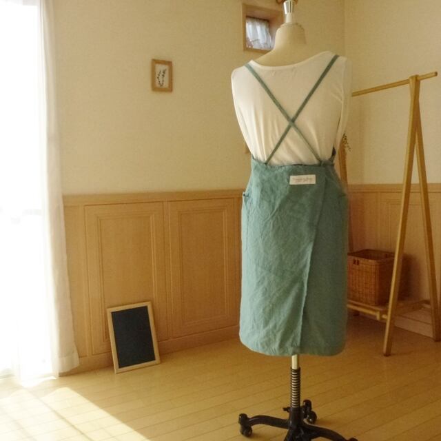 セミオーダー/88cm丈バッククロスエプロン/コットンリネン(アッシュグリーン)