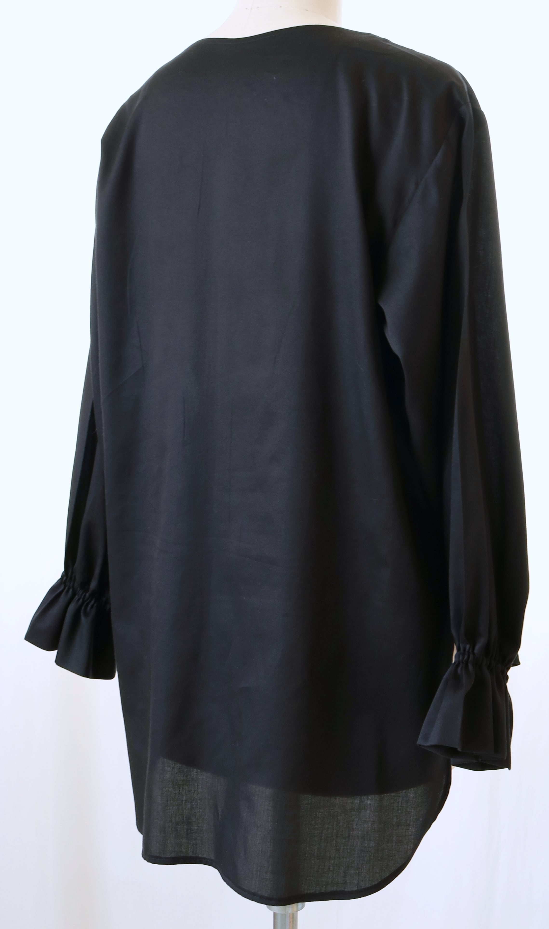 飴をくるくるっと包んだようなデザインのキャンディスリーブが特徴的なブラウスです。一見、袖口が邪魔になりそうなイメージですが、ゴム入りなので、袖口をたくし上げることもできてとても機能的。